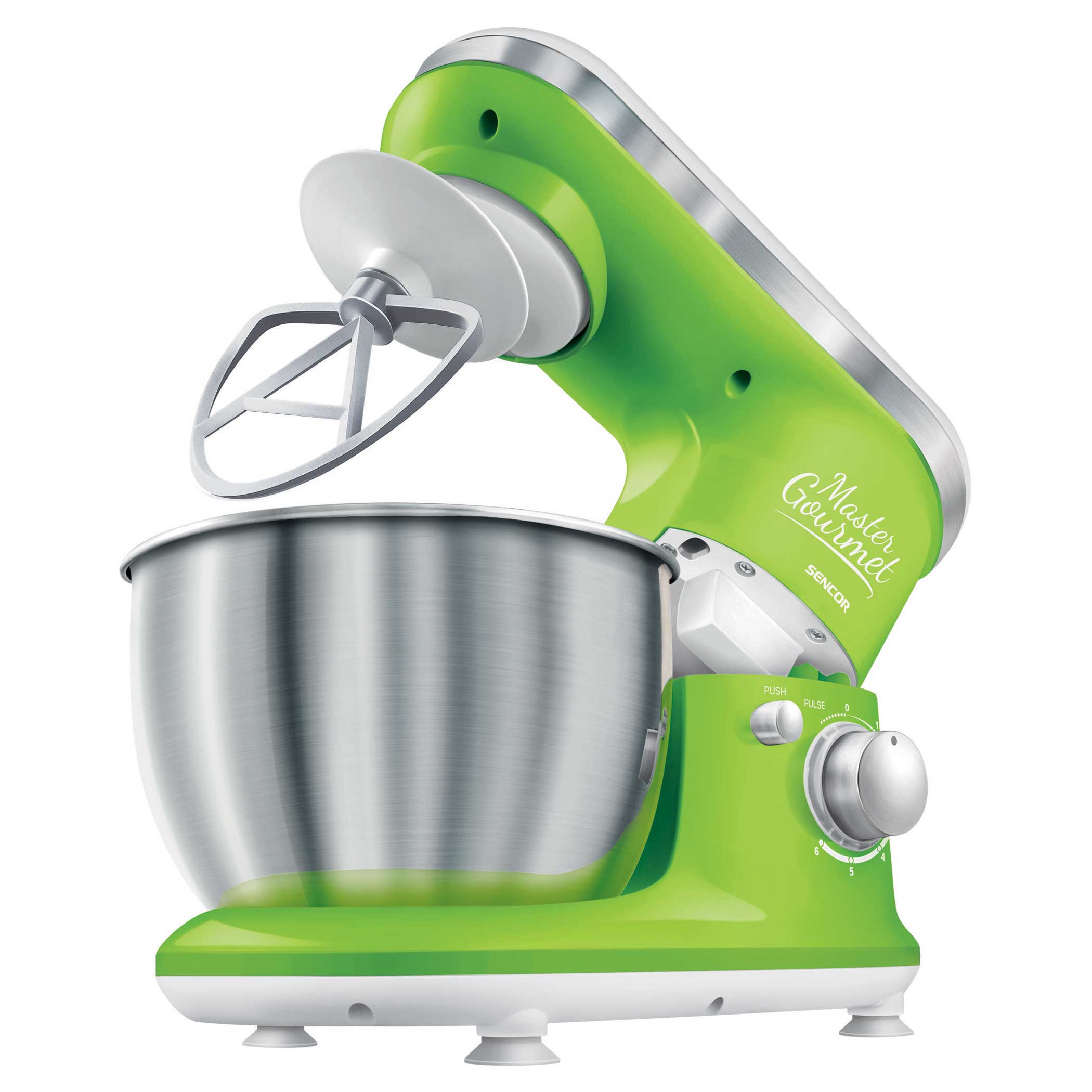 4 zamjenjiva dodatka: kuka za miješenje (za teška i tvrda tijesta s kvascem), nastavak u obliku slova A (za kreme i lagana tijesta bez kvasca), nastavak u obliku balona za tučenje (za tučenje šlaga, bjelanjaka, itd.), zaštita za lijevanje